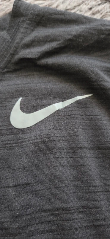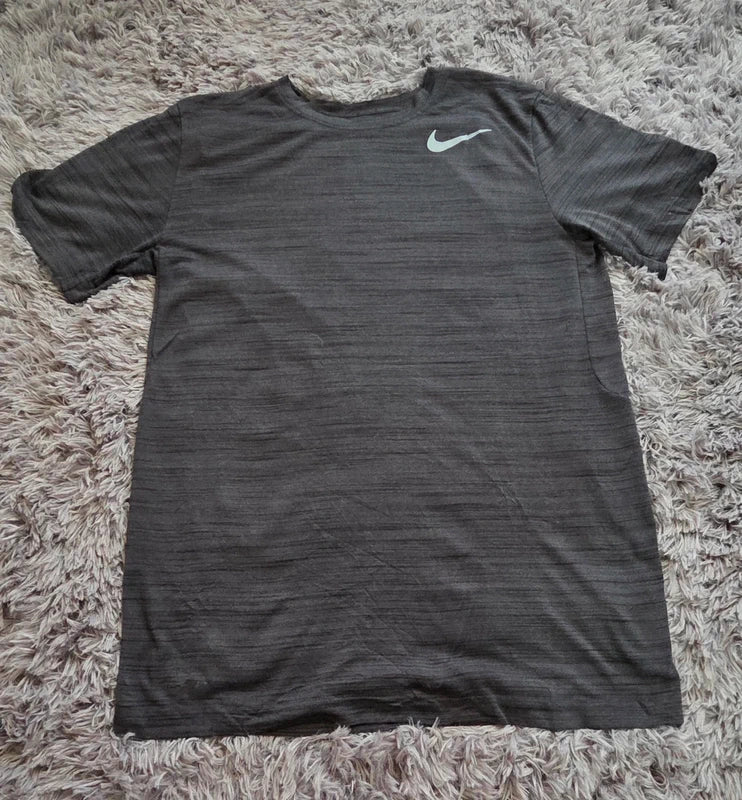 Camiseta Nike original de entrenamiento en color gris oscuro jaspeado, con diseño minimalista y swoosh blanco. Tejido ligero y transpirable, ideal para gimnasio, running o looks deportivos diarios.