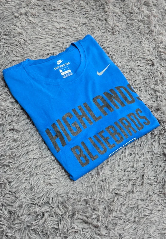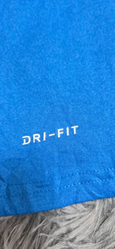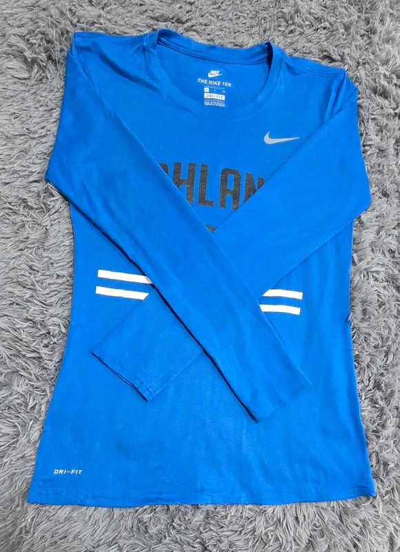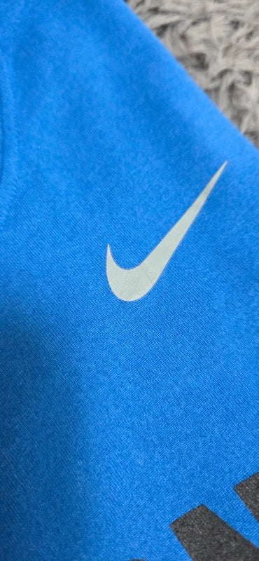 Camiseta Nike de manga larga con tecnología Dri-FIT, diseñada para ofrecer comodidad y transpirabilidad. Color azul intenso con detalles reflectantes en las mangas y logo Nike en el pecho.