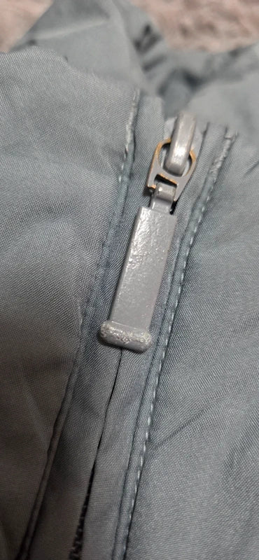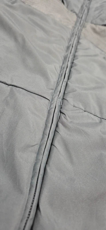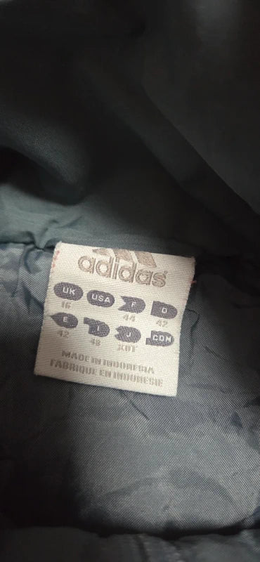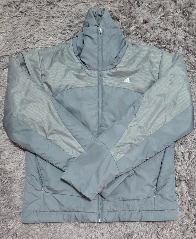 Chaqueta acolchada Adidas original con capucha y cierre de cremallera completa. Diseño ligero pero abrigado en tono verde grisáceo, con logo Adidas en el pecho y ajuste cómodo para el uso diario.