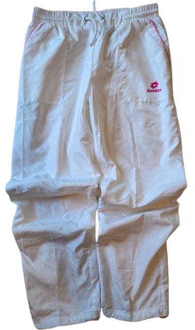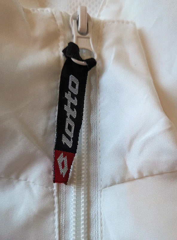 Chándal auténtico estilo retro de la marca Lotto, en color blanco con detalles rosa. Conjunto de chaqueta con cremallera y pantalón con cinturilla elástica. Tejido ligero y cómodo, ideal para lograr un look urbano deportivo con esencia de los 90s. Pieza única en excelente estado.
