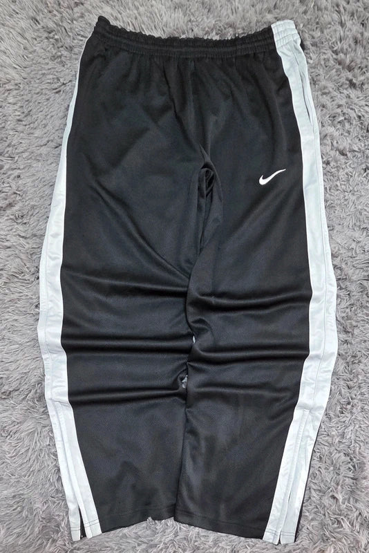 Pantalón deportivo Nike original en color negro con franjas blancas laterales. Diseño clásico de chándal con cintura elástica y logo Nike bordado. Cómodo, versátil y fácil de combinar tanto para uso deportivo como para looks streetwear y casuales.
