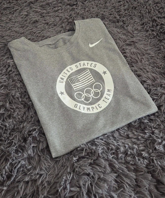 Camiseta Nike original del United States Olympic Team con tecnología Dri-FIT. Diseño en color gris jaspeado con escudo olímpico USA en el pecho y logo Nike. Prenda cómoda y ligera, ideal tanto para uso deportivo como para looks casuales de estilo sport americano.