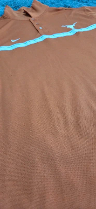 Polo Nike oficial Texas Longhorns con diseño clásico universitario NCAA. Color naranja icónico con franja horizontal blanca, logo Longhorn bordado en el pecho y swoosh Nike. Estilo retro deportivo inspirado en el fútbol americano universitario.